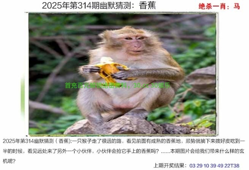 314期图片猜测(香蕉)【开:發00】 一只猴子走了很远的路,看见前面有成熟的香蕉地,顺势就摘下来拨好皮吃到一半的时候,看见远处来了另外一个小伙伴,小伙伴会抢它手上的香蕉吗?......本期图片会给我们带来什么样的玄机呢? 解:一只猴子解左肖鼠牛龙蛇猴鸡幽默猜测推荐六肖:龙鼠鸡牛猴蛇本期猜测看好十码:14.38.18.42.33.45.17.29.22.37点击注册30.cc娱乐城3090.com大额无忧 |